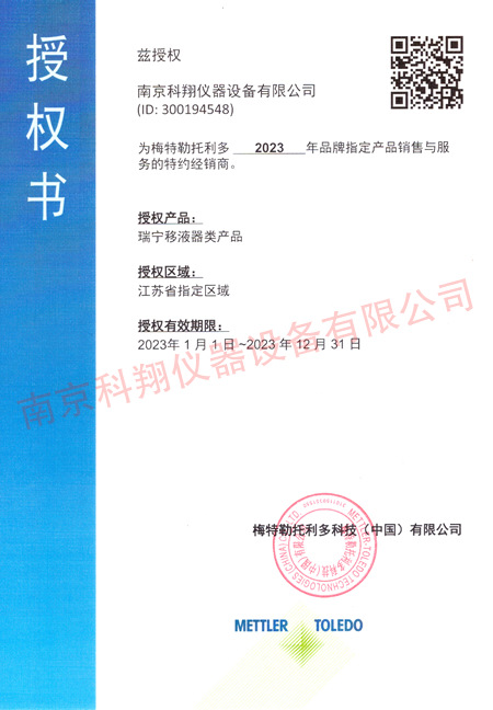 梅特勒托利多瑞宁移液器类产品授权书